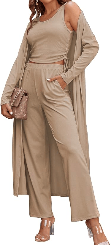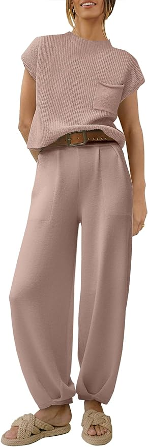 For a laid-back yet fashionable look, opt for this women's two-piece sweater set outfit. With a cap shoulder knit pullover crop top, relaxed fit high waist taper knit pants, this is an effortless cozy and chic outfit for when you're on the go. Complete the outfit with a pair of slides or white sneakers for a touch of casual elegance. This outfit is perfect for long flights or days spent exploring new cities.